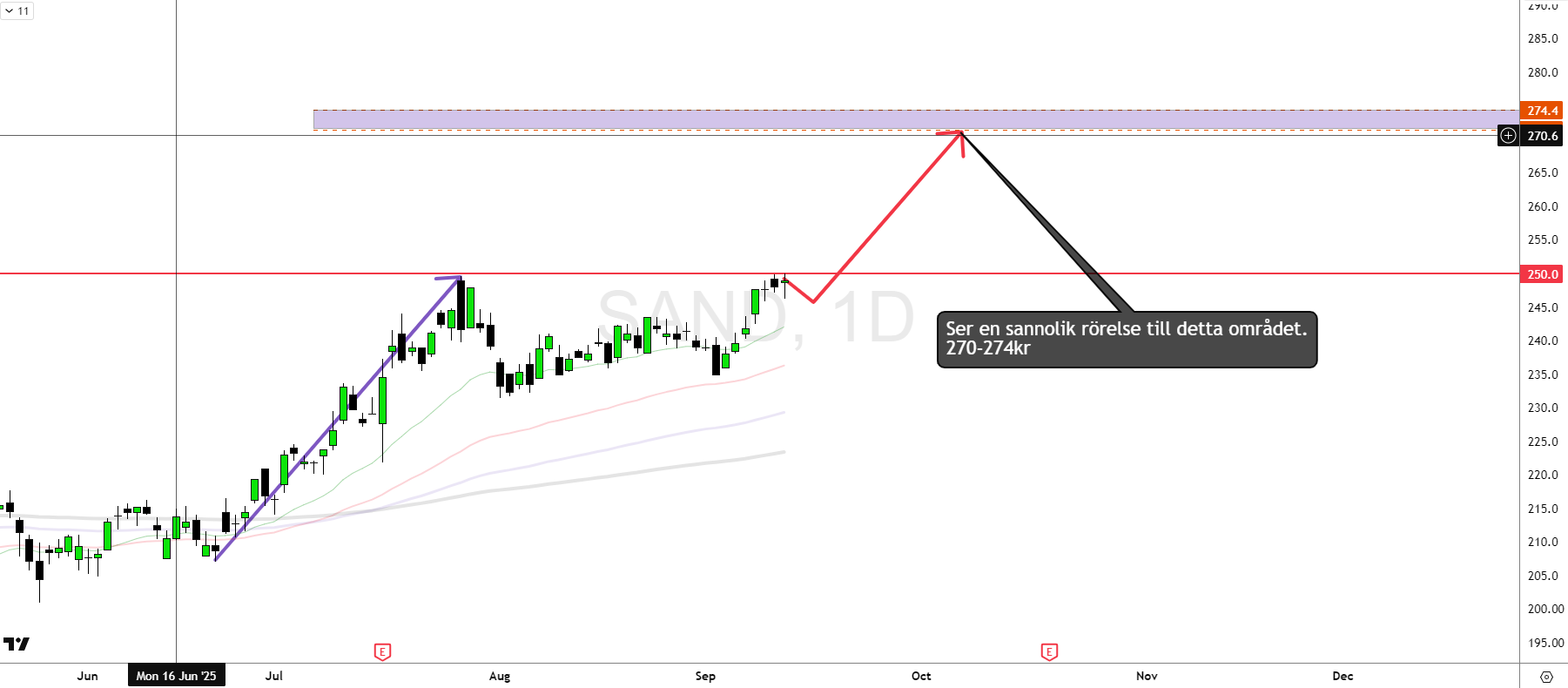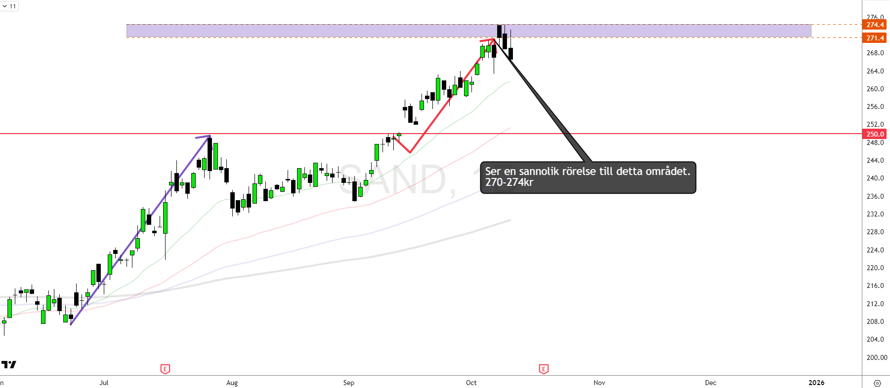 En ny riktkurs på Sandvik AB publicerades 12 september. Såg en sannolik rörelse mot i första hand ca 270kr. Den stod på 249-250kr vid analys. (20 kr upp)