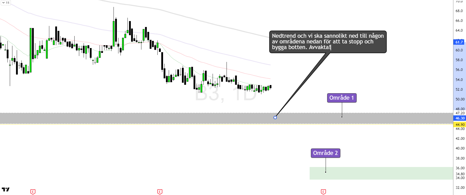 Det gjordes en analys på B3 Consulting AB och den gick primärt ut på att invänta en bottenformation då vi låg i en mer eller mindre full nedtrend, såg ett potentionellt område först kring 45-47kr och om det bryts 34-36kr.